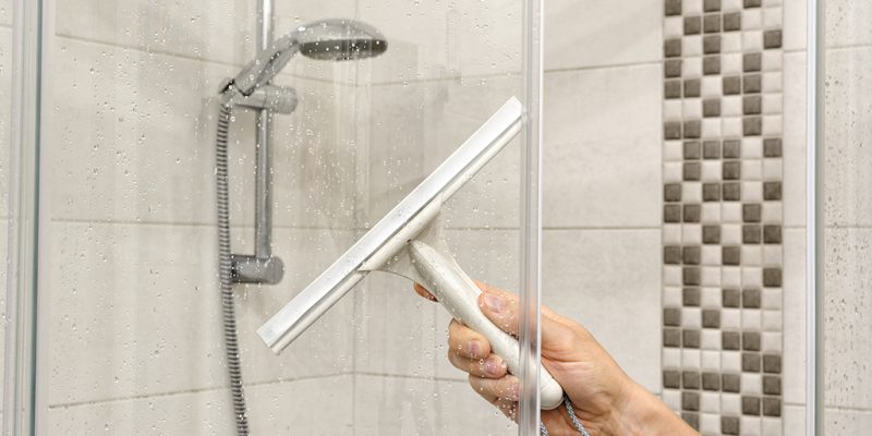 - Keep a small squeegee hanging in the shower and use it on the glass after every shower. This removes water droplets before they dry and leave mineral residue.
